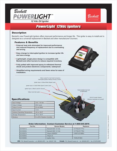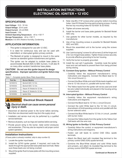 Igniter for Becket oil burners series "S". Rated for 12 Volt with a back hinge.