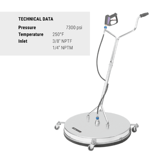 The surface cleaner for cold and warm water applications. This popular surface cleaner is a top performer and is perfect for cleaning parking lots, gas stations, school yards, entry ways, etc.