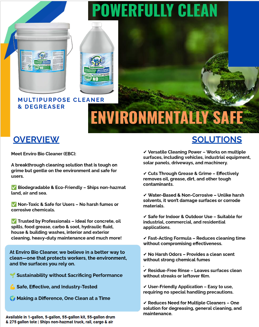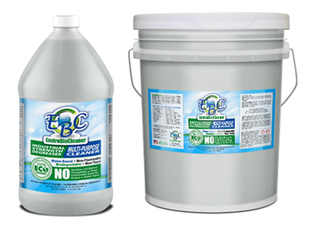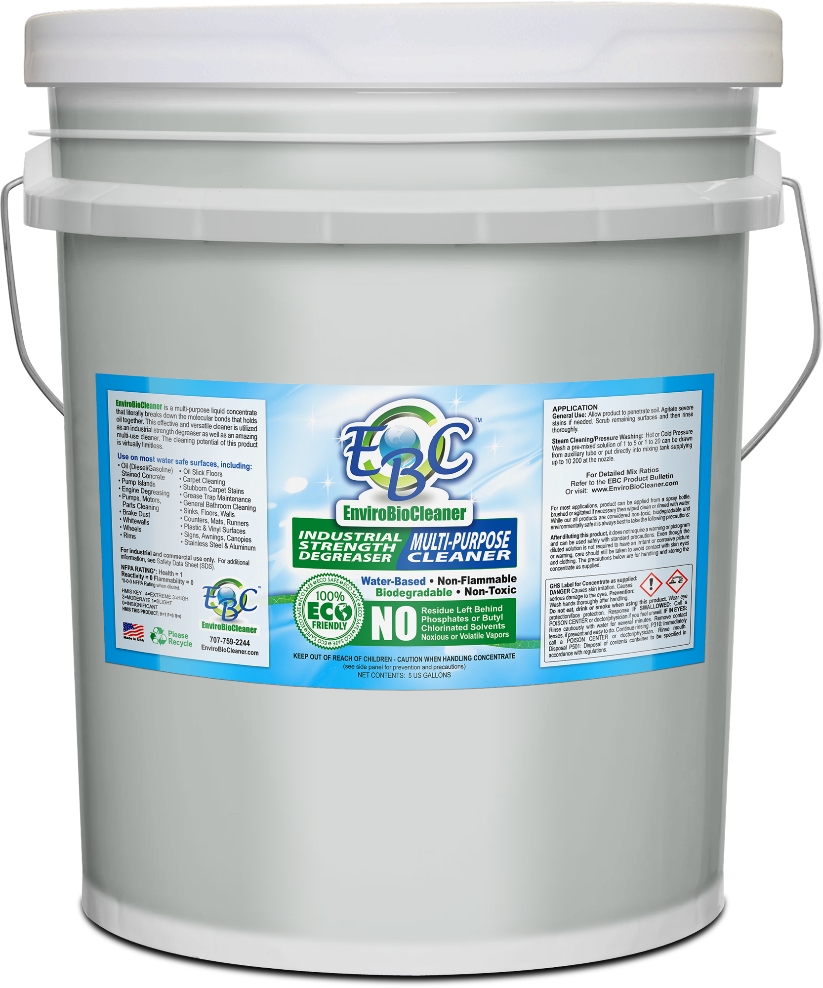 When Nothing Else Cuts It – Enviro Bio Cleaner (EBC) works hard so you don't have to. This heavy-duty cleaner is the answer to heavy-duty grease and general multi-purpose cleaning. EBC leaves drive through, gas station pads, oiled/greased concrete, hood and filter cleaning, house washes, machinery, garage floors and much much more clean and grease-free. The variety of uses for EBC is virtually unlimited. Rated and Tested high for effectiveness, safety, and environmental impact.