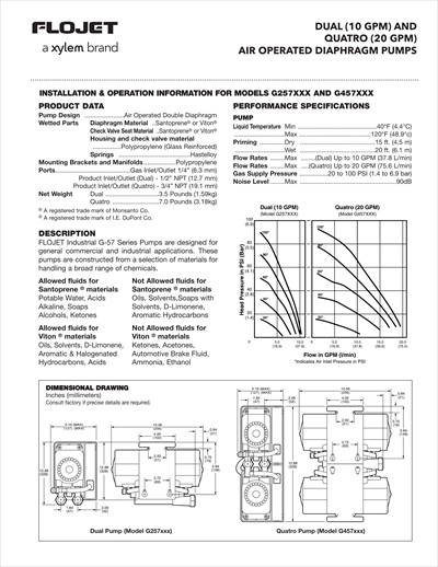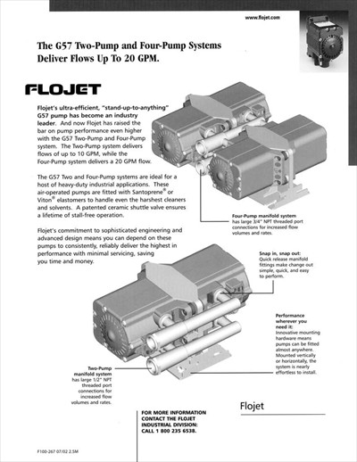Flojet's ultra-efficient, "stand-up-to-anything" G57 pump has become an industry leader. Flojet has raised the bar on pump performance even higher with the G57 Two-Pump system. The Two-Pump system delivers flows of up to 10 GPM and is ideal for a host of heavy-duty industrial applications. These air-operated pumps are fitted with Santoprene or Viton elastomers to handle even the harshest cleaners and solvents.