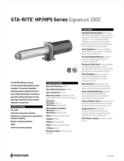 Sta-Rite HPS Series Stainless Steel Booster Pumps are among the most durable booster pumps available for domestic water applications. The Signaseal floating impeller design minimizes thrust loads šš®š©š©šØš«šš¬ allowing for continuous operation without damage to motor bearings, mechanical seal, or pump hydraulic components.