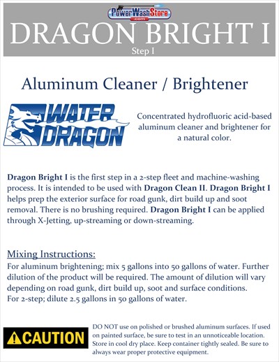 DRAGON-BRIGHT is a highly concentrated acid-based aluminum cleaner and brightener. DRAGON-BRIGHT is formulated to clean aluminum surfaces leaving the surface a natural aluminum color.