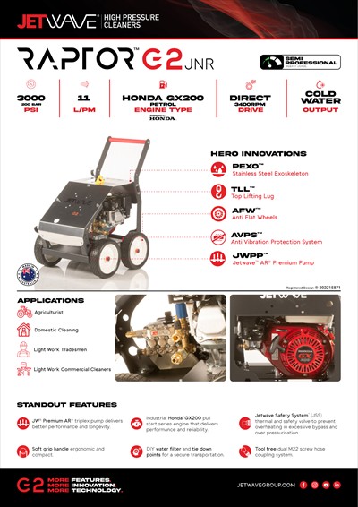 The Jetwave® Raptor™ G2 is a groundbreaking pressure washer designed to transform the pressure washing industry. Engineered and assembled in Australia, it incorporates the finest Italian and global components, ensuring superior performance and reliability. Here are the key features of this innovative pressure washer: