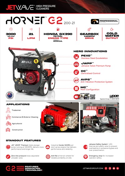 The Jetwave® Hornet G2™ transforms the landscape of single-cylinder gearbox petrol-driven cold water high-pressure cleaners powered by HONDA™. Engineered and assembled in Australia, this innovative unit caters to heavy-duty users with its compact, powerful, safe, and user-friendly design, featuring a stainless steel exoskeleton (PEXO™) cover for protection, centralized control, and multi-configurable features.