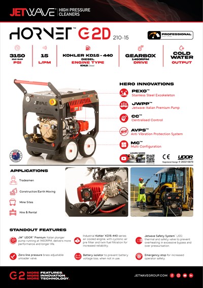 The Jetwave® Hornet G2D™ transforms the landscape of single-cylinder gearbox diesel-driven cold water high-pressure cleaners powered by KOHLER™. Australian engineered and assembled, this innovative unit provides heavy-duty users with a compact, powerful, safe, and easy-to-use design, featuring a stainless steel exoskeleton (PEXO™) cover for protection, centralized control, and multi-configurable features.
