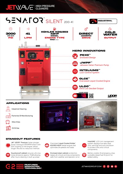 The Jetwave® Senator™ Silent sets a new standard for professional diesel cold water pressure washers, boasting ultra-low decibel levels that 𝐒𝐮𝐩𝐩𝐨𝐫𝐭𝐬 allow for continuous 24/7 operation.
