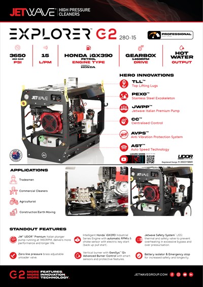 The Jetwave® Explorer™ G2 transforms the single-cylinder gearbox petrol-driven high-pressure hot water cleaner powered by HONDA™, offering a revolution in design and innovation. Australian engineered and assembled, it caters to heavy-duty users with a compact, powerful, safe, and user-friendly unit featuring a stainless steel exoskeleton (PEXO™) cover, centralized control, and multi-configurable design.