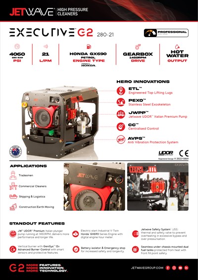 The Jetwave® Executive™ G2 is a heavy-duty professional hot water V-twin petrol pressure washer powered by HONDA™, setting new standards in design and innovation. Australian engineered and assembled with premium Italian and global components, it features a world-first compact multi-configurable modular design and cover protection for maximized safety, functionality, and efficiency.
