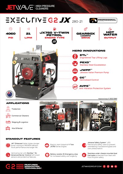The Jetwave® Executive™ G2 JX is a heavy-duty professional hot water V-twin petrol pressure washer powered by the JX 750 engine, marking a revolution in design and innovation. Australian engineered and assembled with premium Italian and global components, it introduces a world-first compact multi-configurable modular design and cover protection for maximum safety, functionality, and efficiency.
