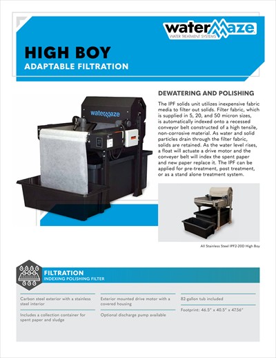 The Indexing Polishing Filter (IPF) Solids Unit is designed for dewatering and polishing processes, employing cost-effective fabric media to filter out solids. The filter fabric comes in 5, 20, and 50 micron sizes and is automatically indexed onto a recessed conveyor belt made of high-tensile, non-corrosive material. As water and solid particles pass through the filter fabric, solids are retained. A float, activated as the water level rises, drives a motor to index the spent paper and replace it with new paper. The IPF can be utilized for pre-treatment, post-treatment, or as a standalone treatment system.