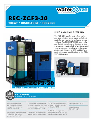 The REC-ZCF Combo Skid provides a plug-and-play solution with a pre-piped and wired unit, ready for quick connection to tanks and pressure washers. This skid combines the features of REC and ZCF, offering a powerful and flexible pump and filtration system. It serves as a central hub for various water treatment, recycling, and discharge options. Importantly, all the original features of REC and ZCF are retained in the REC-ZCF Skid system without modifications.