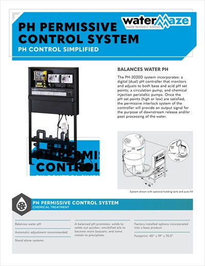 The PH-3020D system functions as a pH meter and controller, designed to simplify wastewater treatment by promoting quicker settling of solids, increased buoyancy of emulsified oils, and precipitation of certain metals. Extreme pH levels can adversely affect water treatment system performance, making automatic pH adjustment highly recommended. Water Maze offers various automatic pH control systems, some integrated into the base product, others available as factory-installed options or standalone systems. The PH-3020D includes a digital pH controller that monitors and adjusts both base and acid pH ranges, a circulation pump, and chemical peristaltic pumps. Once the pH set points are met, the controller's permissive interlock system signals downstream release and/or post-processing of the water. This system provides efficient and automated pH control for enhanced wastewater treatment.