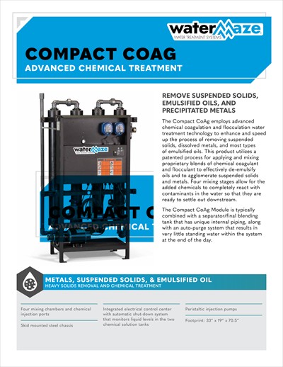 The Compact CoAg utilizes advanced chemical coagulation and flocculation water treatment technology to expedite the removal of suspended solids and various emulsified oils. This product employs a patented process to apply and mix proprietary blends of chemical coagulant (CoAg+) and flocculant (EC+), effectively de-emulsifying oils and agglomerating suspended solids. Typically combined with a separator/final blending tank featuring unique internal piping and an auto-purge system, the Compact CoAg minimizes standing water within the system at the end of the day. When paired with the Water Maze IPF2-20 Indexing Polishing Filter, the unit removes agglomerated solids and oils from a clarified stream, enabling recycling or discharge in accordance with local regulations. With four mixing stages, the Compact CoAg ensures thorough chemical reactions with contaminants, preparing them for downstream settling.