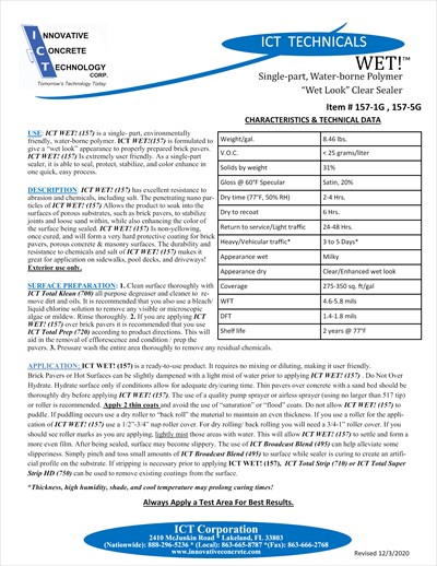 WET! is an environmentally-friendly, single-component polymer, water-borne clear sealer. WET! is formulated to give a “wet look” appearance to properly prepared concrete pavers. As a single-part sealer, WET! is extremely user-friendly and able to seal, protect, stabilize, and color enhance in one quick, easy process.