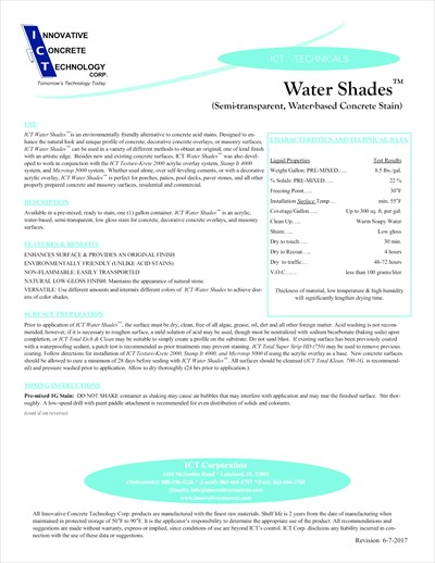 A friendly alternative to concrete acid stains, Water Shades is a water-based stain designed to enhance the natural look and unique profile of concrete or masonry surfaces. Water Shades can be used in a variety of different methods to obtain an original, one of a kind finish with an artistic edge. Besides new and existing concrete surfaces, Water Shades was also developed to work in conjunction with ICT Texture-Krete 2000, Stamp It 4000, and other overlay systems. Perfect for pool decks, porches, patios, interior floors (commercial and residential) and all other properly prepared concrete and masonry surfaces.