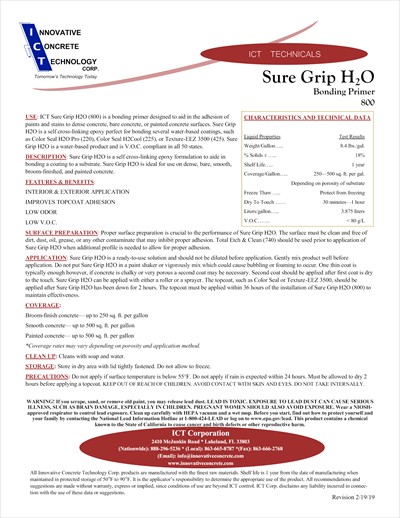 Sure Grip H₂O is a bonding primer designed to aid in the adhesion of paints and stains to dense concrete, bare concrete, or painted concrete surfaces. Sure Grip H₂O is a self-crosslinking epoxy perfect for bonding several water-based coatings, such as Color Seal H₂O Pro (220), Color Seal H₂Cool (225), or Texture-EEZ 3500 (425). Sure Grip H₂O is a water-based product and is V.O.C. compliant in all 50 states.