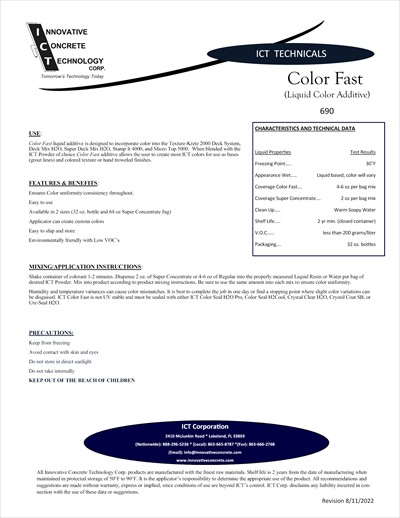 Color Fast is a liquid integral color additive is designed to incorporate into all ICT deck systems. When blended with ICT Liquid Resin, Deck Mix H₂O, or Stamp It 4000, Color Fast 𝐒𝐮𝐩𝐩𝐨𝐫𝐭𝐬 allows the user to create most of ICT colors for use as bases (grout lines) and colored texture, hand troweled, and stamp finishes.