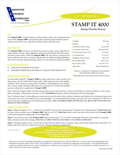 Stamp It 4000 is an easy to use add water only decorative concrete overlay stamping system composed of a unique blend of cement, mineral aggregates, polymers and chemicals that forms a tough and durable surface. While the Stamp It 4000 50 pound bag mixture is designed to be easily combined with water, its structure also provides for superior bonding capabilities, freeze-thaw resistance and quick drying, which saves Time and money during installation. Stamp It 4000 is designed for both commercial and residential concrete surfaces such as driveways, walkways, pool decks, patios and much more.