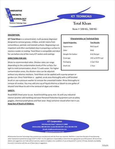 Total Klean is a concentrated, multi-purpose degreaser used to remove grease, oil, mildew, dirt, stains, etc. from cementitious, painted, and stained surfaces. This highly concentrated cleaner is ideal for properly cleaning and preparing your concrete surface. Total Klean is also available in an extra-concentrated formula.